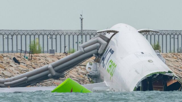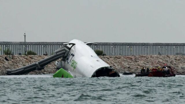 Hajnalban a honkongi nemzetközi repülőtéren egy Jumbo teherszállító repülőgép a futópályáról lesodródott, elütött egy biztonsági autót és a tengerben összetört. Képek róla, amit nagyítva érdemes megnézni. A harmadik képen található rajz pontosan bemutatja az esemény helyét és az adatokat.